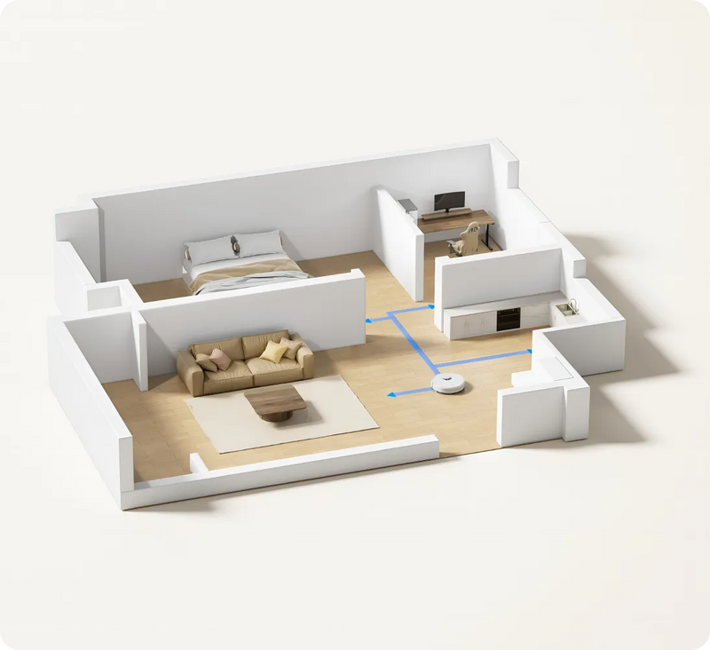 D9 Max Gen 2 ustvari prilagodljiv zemljevid za natančno čiščenje, kar zagotavlja gladko gibanje in optimalne poti čiščenja po vašem domu.