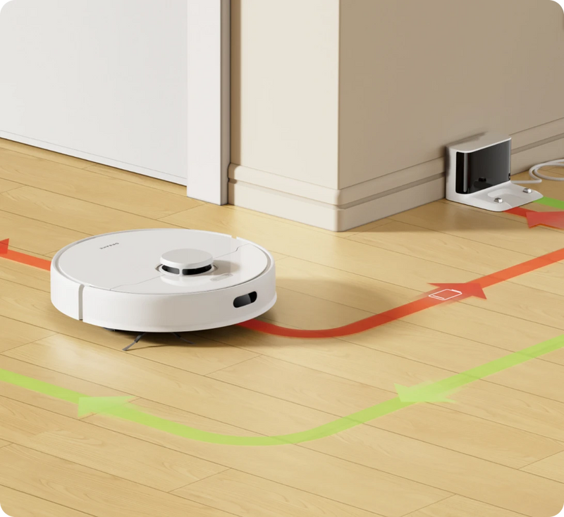 Ko je baterija skoraj prazna, se D9 Max Gen 2 samodejno vrne na polnilno postajo, da se napolni, in nato nadaljuje čiščenje tam, kjer je pred polnjenjem končal, za zagotovljeno čistočo.