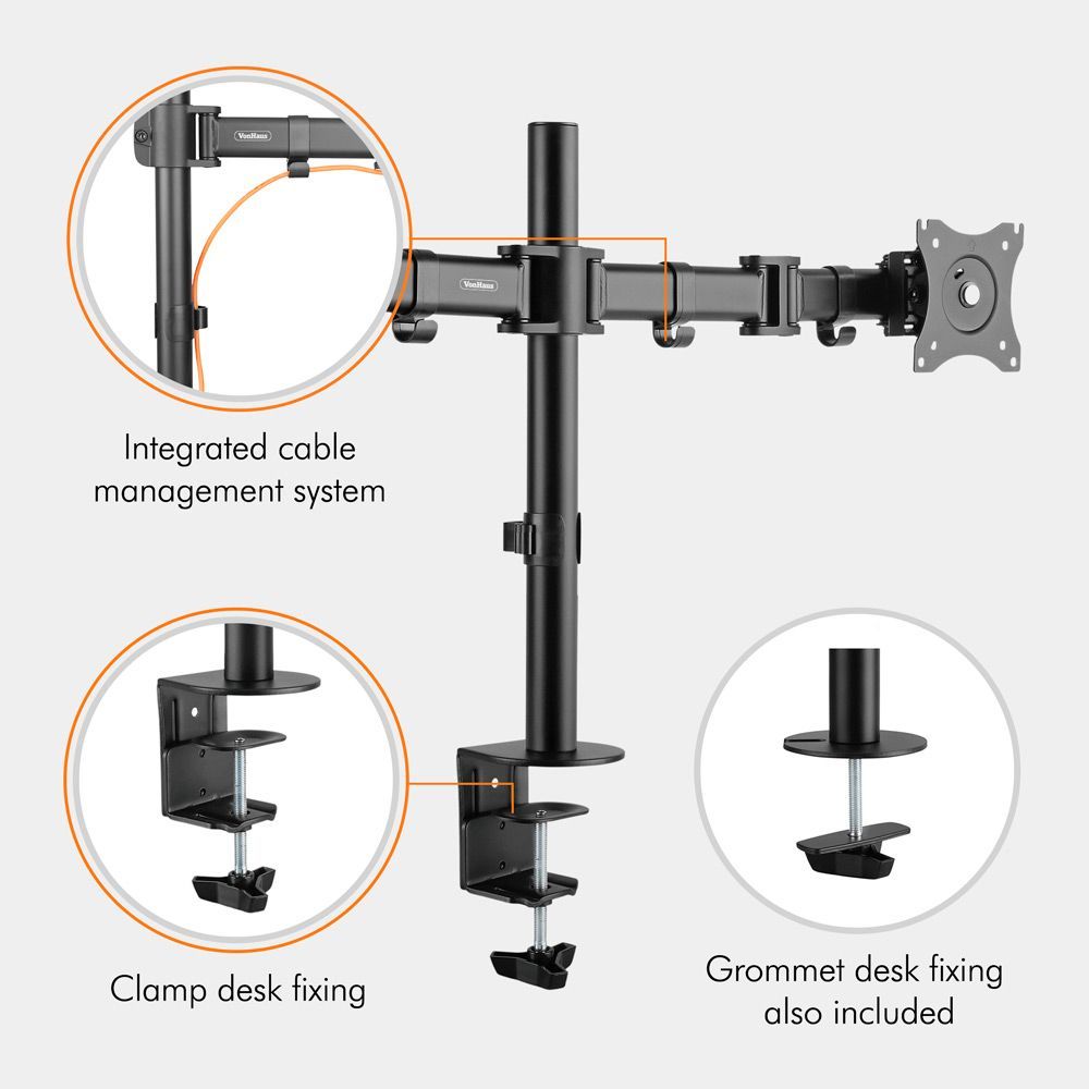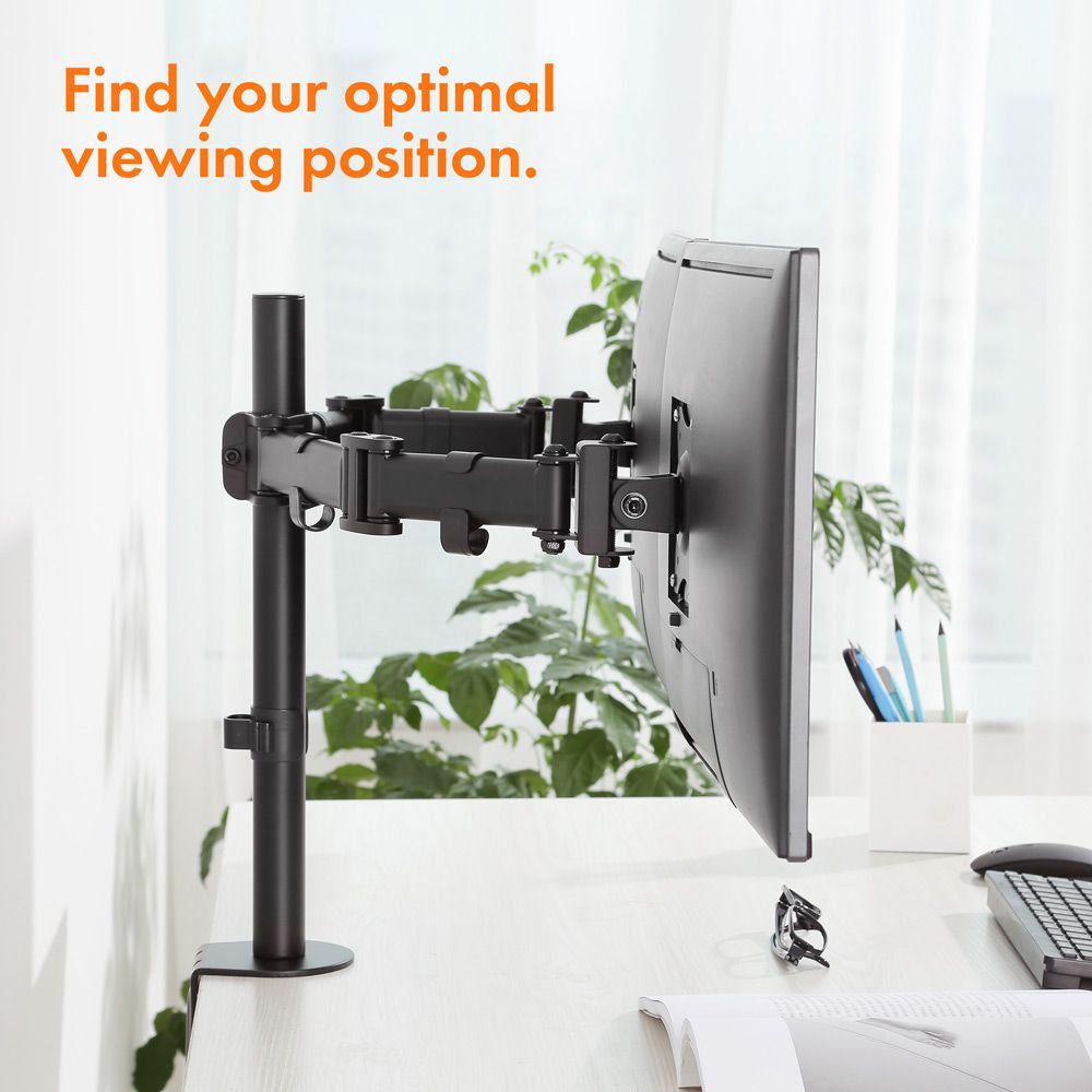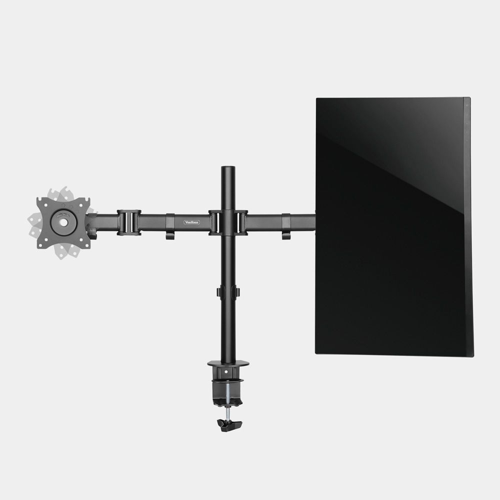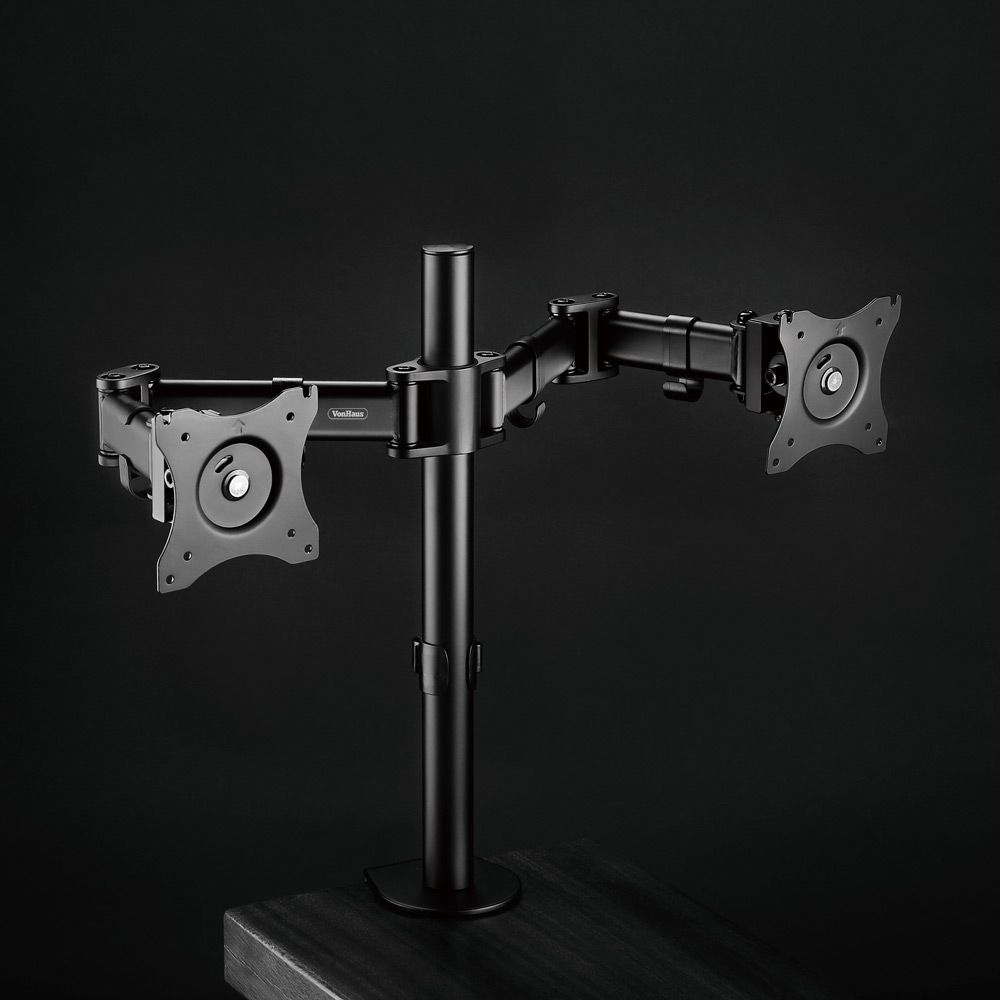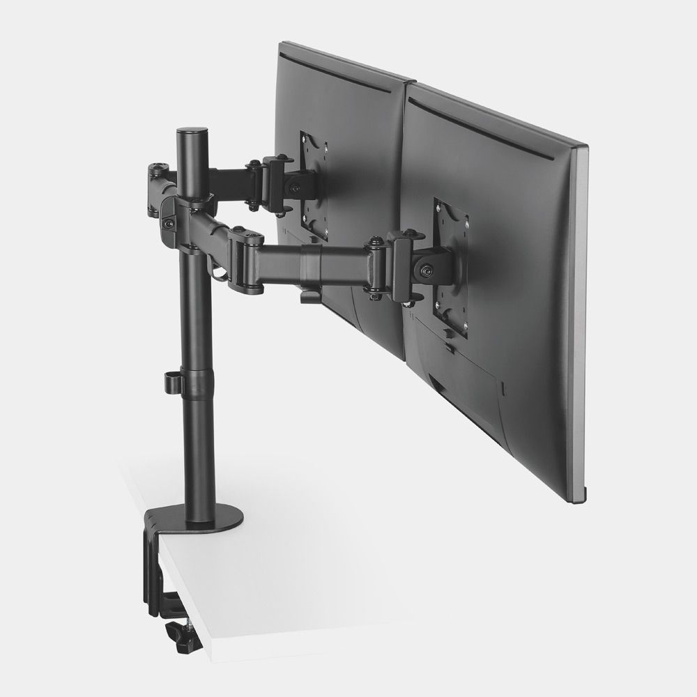 Dvojni namizni nosilec za monitorje (13-32'') z nagibom, zasukom in rotacijo. Maksimalna obremenitev 8 kg/roko, enostavna montaža.