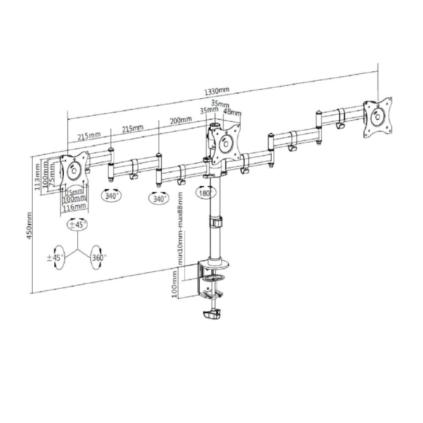 Vonhaus nosilec za tri monitorje (13-27''). Nagib in zasuk. Maksimalen izteg 45 cm. Podprta teža 8,0 kg / monitor. Uradna stran za več informacij.
