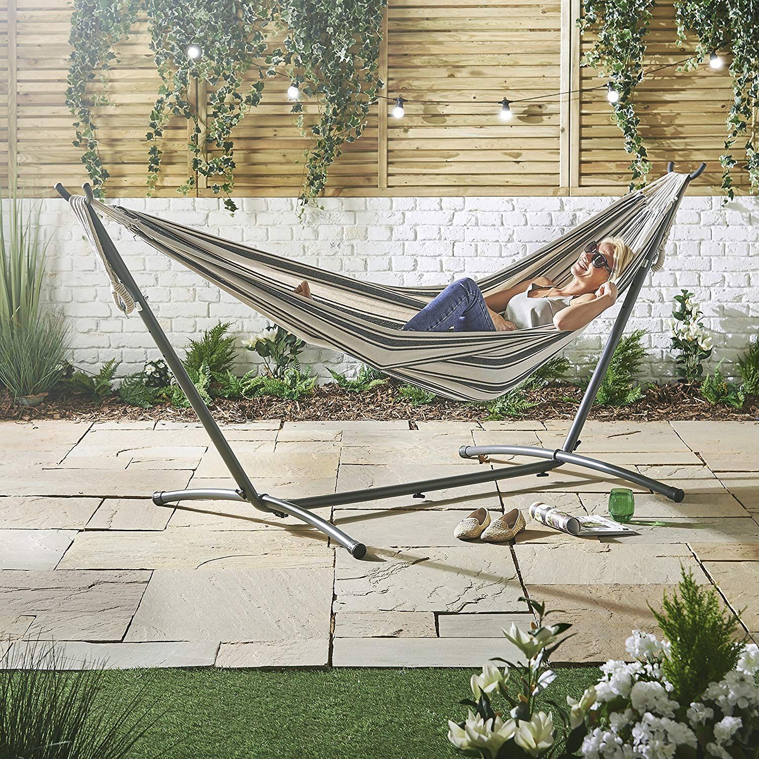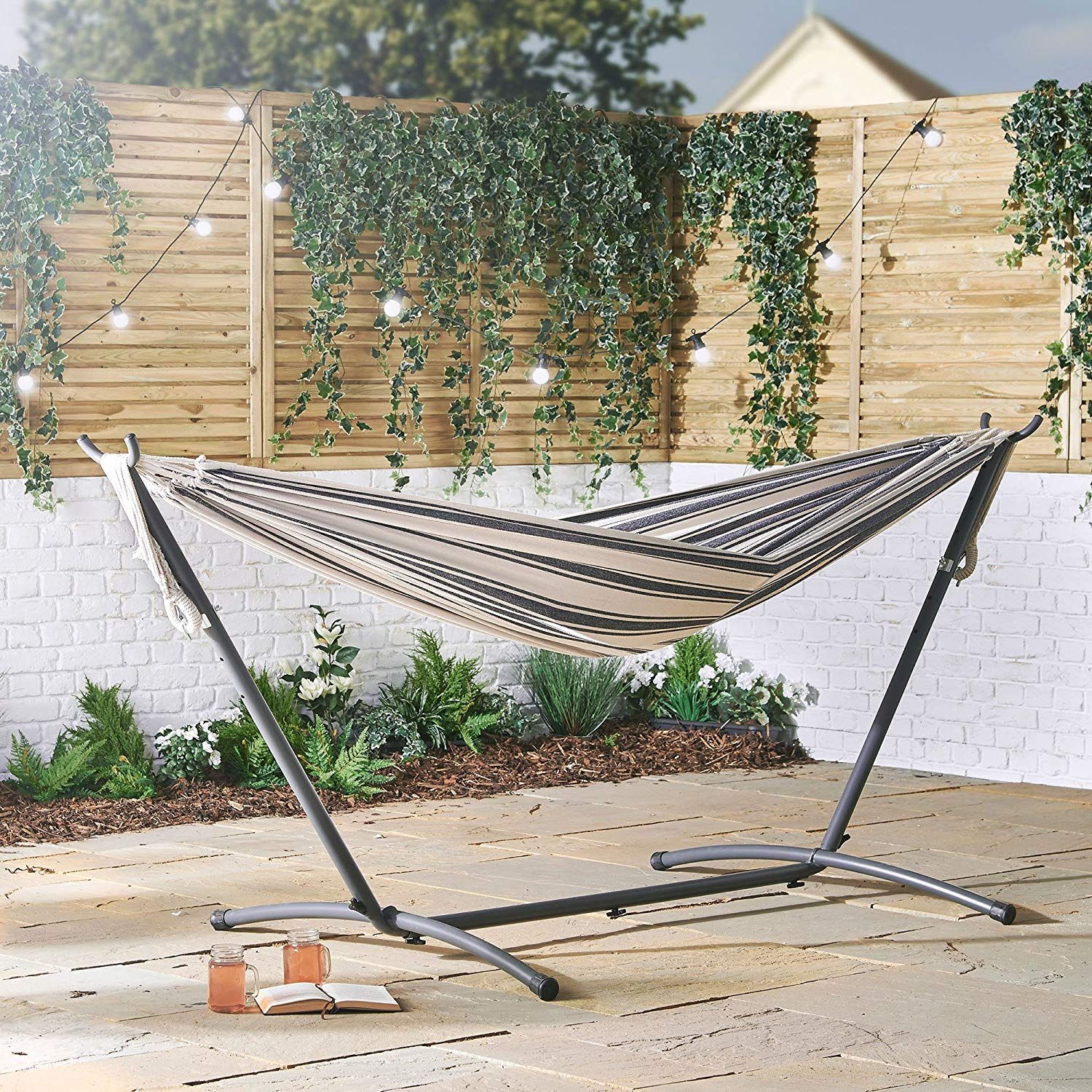 Udobna viseča mreža VonHaus za dva z močnim okvirjem. Enostavna za prenašanje, idealna za sprostitev na soncu. Velikost: 119cm x 305cm x 112cm.